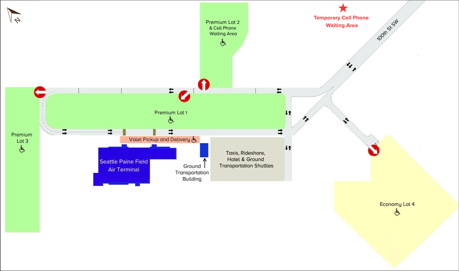 To accommodate increased Spring travel, the Cell Phone Lot has been temporarily relocated adjacent to the Museum of Flight Restoration Center (2909 100th Street SW, Everett, WA 98204). Please refer to the map above and follow on-site signage for directions. The Cell Phone Lot will return to its original location in the P2 parking lot in mid-April, 2026.